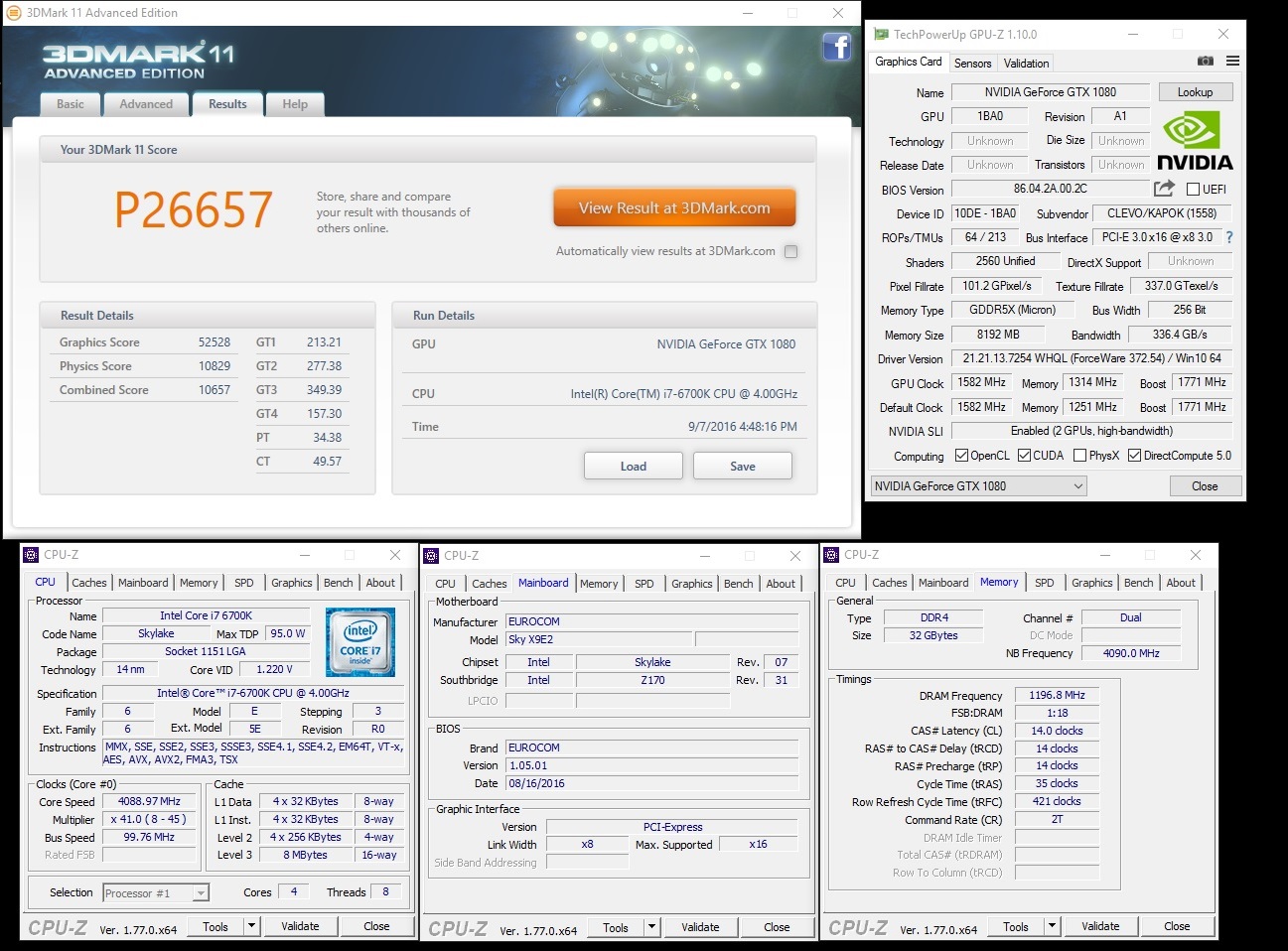 Sky X9E2 3DMark 11; NVIDIA GeForce GTX 1080 SLI, 6700K; 32GB DDR4-2400; Score: P26657
