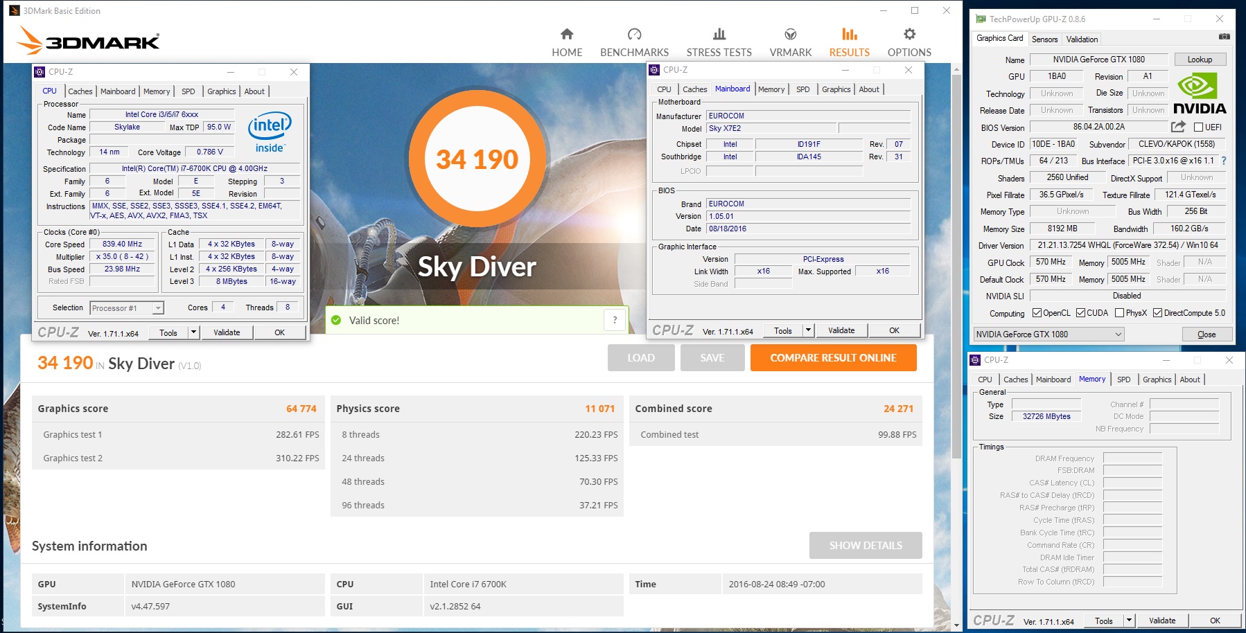 EUROCOM Sky X7E2; 3DMark Sky Diver; NVIDIA GeForce GTX 1080; Score: 34 190
