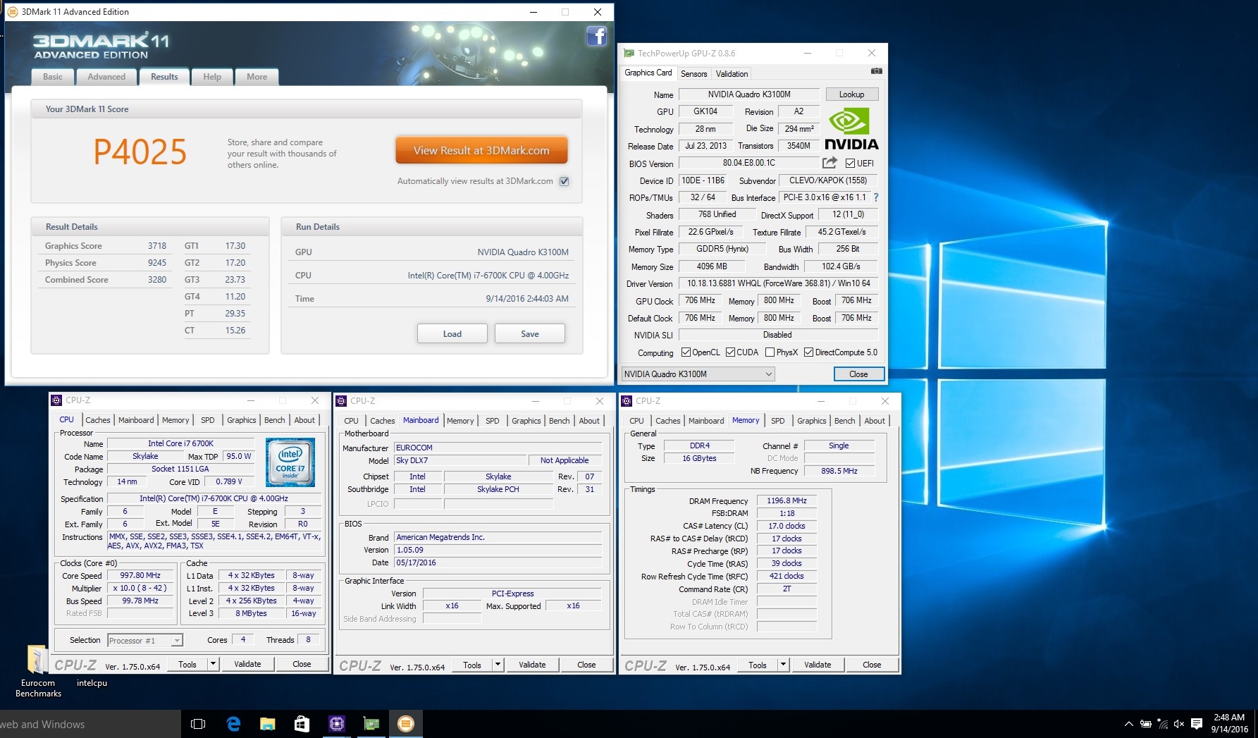 • EUROCOM Sky DLX7 - 3DMark 11 - NVIDIA Quadro K3100M - Score: P4025