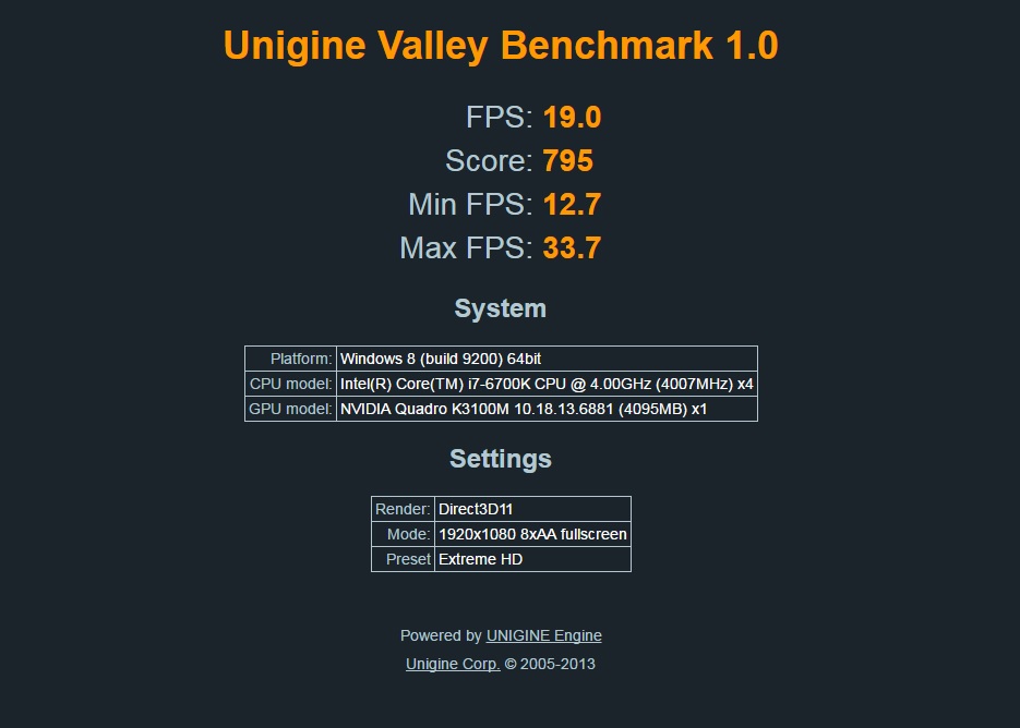 • EUROCOM Sky DLX7 - Unigine Valley - NVIDIA Quadro K3100M - Score: 795