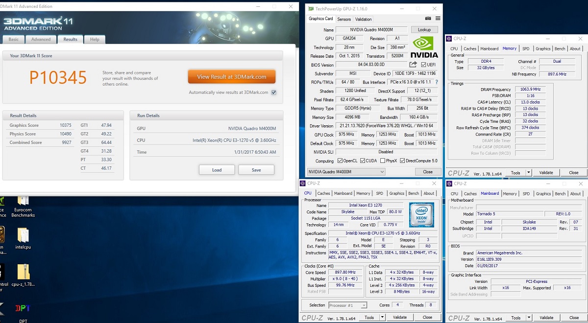 • EUROCOM Tornado F5W - 3DMark11 - NVIDIA Quadro M4000M - Intel Xeon E3 1270 v5 - Score: P10345