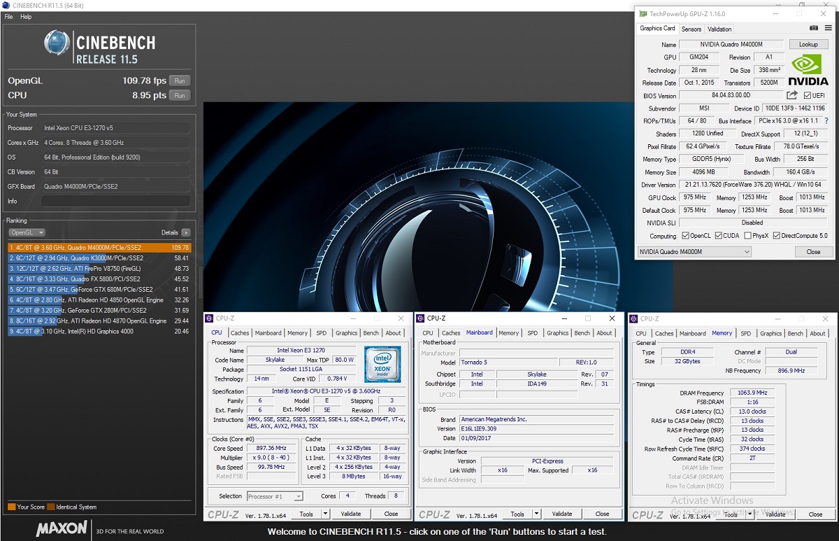 • EUROCOM Tornado F5W - Cinebench R11.5 - NVIDIA Quadro M4000M - Intel Xeon E3 1270 v5 - OpenGL: 109.78