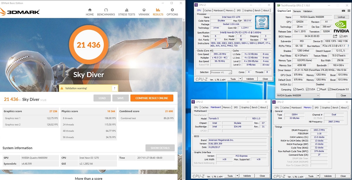 • EUROCOM Tornado F5W - 3DMark Sky Diver - NVIDIA Quadro M4000M - Intel Xeon E3 1270 v5 - Score: 21 436