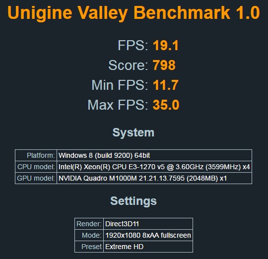 • EUROCOM Tornado F5W - Unigine Valley1 - NVIDIA Quadro M1000M - Intel Xeon E3 1270 v5 - Score: 798