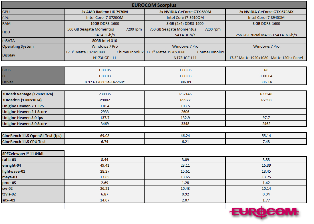 • SLI vs CF; 2x NVIDIA GTX 680M 4GB DDR5 vs 2x AMD HD7970M 2GB DDR5 vs NVIDIA GeForce GTX 675MX