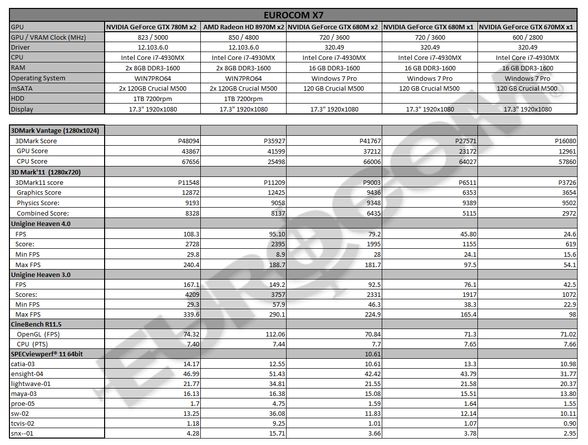 • NVIDIA GeForce GTX 680M, AMD Radeon HD 8970M, NVIDIA GeForce GTX 780M SLI and CrossFireX in EUROCOM X7