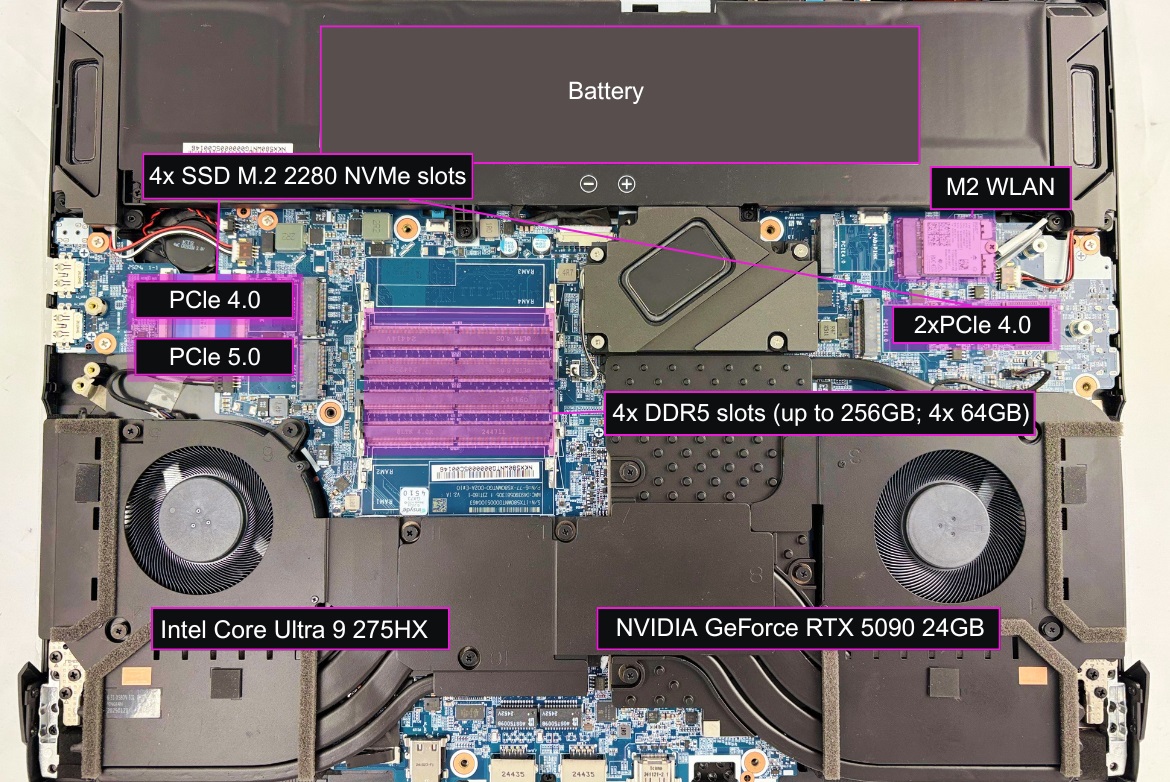 Raptor X18 supports up to 256GB of DDR5 memory via 4x RAM slots and up to 32TB of SSDs via 4x M.2 NVMe slots.