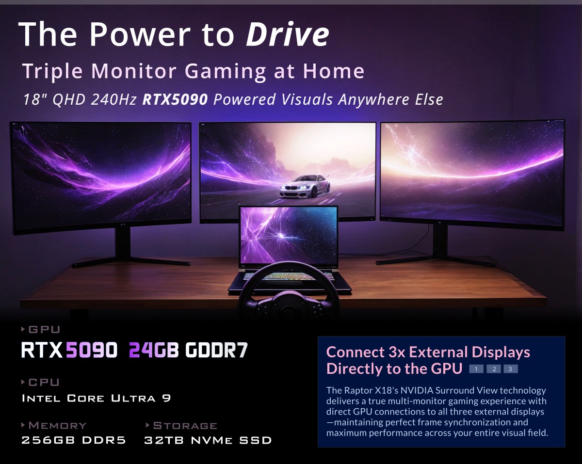 EUROCOM Raptor X18 Mobile Supercomputer is powered by Intel Core Ultra 9 Processor 275HX 24C/24T Processor with 36M cache and NVIDIA GeForce RTX 5090 24GB DDR7 with NVIDIA Blackwell architecture and 680 Tensor AI cores. It supports up to 32TB of NVME SSD storage in RAID 0/1/5 and two Thunderbolt 5 ports allowing up to 3 external monitors connected directly to dGPU. Supports the most advanced and demanding use cases in AI & Machine Learning in Finance, ECommerce, Security, Automotive, Forensic, Virtual Reality & Augmented Reality and other industries. Perfect for AI and EDGE computing on-the-go deployment.
