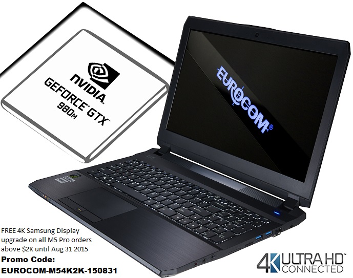 Aug 07, 2015 Eurocom offering 15.6” 4K Samsung Display Panel upgrade in the M5 Pro Laptop Contact: Braden Taylor 613-656-7961 btaylor@eurocom.com When ordering a new, ugradeable EUROCOM M5 Pro, customers can receive a free display upgrade to the 15.6” 4K UHD 3840x2160 Samsung display panel by ordering a system configured over $2000. This allows customers to spec-out a really powerfully capable system and get rewarded with a free ultra-high resolution display upgrade. FREE 4K Samsung Display upgrade on all M5 Pro orders above $2K until Aug 31 2015 -- Use promo code: EUROCOM-M54K2K-150831 -- Get 6 million more pixels in your EUROCOM M5 Pro by configuring an epic $2000 system -- “We are rewarding our customers who choose to order a EUROCOM M5 Pro performance configuration by giving them a free display upgrade to 4K. Amazingly, we are offering a free 6 million pixels to these customers from a mere 2,073,600 pixels to an astounding 8,294,400 pixels, which amounts to a crystal clear viewing experience.” Mark Bialic, Eurocom President. At Eurocom, choice and upgradeability are paramount for our customers. They demand the best and they demand the ability to choose between varieties of high quality, high performance components. Customers can now choose between a total of six display: two 1920x1080 panels in the AUO B156HAN01.2 matte, LG LP156WF4-SPU1 Glossy, one 3K WQHD 2880x1620 PANASONIC VV16T029D00 matte, and three 4K panels in the Samsung LTN156FL02-L01, SHARP IGZO LQ156D1JX01B Glossy and SHARP IGZO LQ156D1JW04 matte panels. The EUROCOM M5 Pro supports beautiful 15.6-inch 4K 3840-by-2160 displays as well as a FHD 1920-by-1080 displays. The high pixel density of the 4K display with 8,294,400 pixels provides extremely detailed images for true to life content. Eurocom also offers professional colour calibration services to ensure every one of those 8 million pixels are accurate as possible. To power this multitude of pixels the EUROCOM M5 pro supports both NVIDIA GeForce GTX 980M (4GB DDR5), GTX 970M (3GB DDR5) and 965M (2 GB GDDR5) graphics for unbeatable performance, raw power and great battery life. The EUROCOM M5 Pro has two M.2 2280 SSD, SATA interface (RAID 0/1) or One M.2 2280 SSD PCIe Gen2 x2/x4 interface, as well as two changeable 2.5” 7mm(H) HDD/SSD (RAID 0/1), or One changeable 2.5” 9.5mm(H) HDD/SSD, SATA interface. The abundance of storage options gives customers an incredible amount of control over their storage capacity, speed and price. Upgrading the storage and memory on the EUROCOM M5 Pro is so easy Hardware Canucks recently created a video doing just that, here. The EUROCOM M5 Pro has 4 memory slots ready for up to 32 GB of dual channel DDR3 1600MHz or 1866 MHz 204 pin SODIMM. With such massive amounts of RAM available, the M5 Pro becomes a flexible tool for virtualization and high performance computing. Being fully upgradeable the EUROCOM M5 Pro supports 8 GB, 16 GB, 24 GB and 32 GB of memory via 4 or 8 GB modules. The EUROCOM M5 Pro has an Intel HM87 Express Chipset running the Intel Core i7-4710HQ processor with 4 cores, 8 threads running at 2.5 GHz with integrated Intel® HD Graphics 4600. Due to Hyperthreading, the four cores can handle up to eight threads in parallel leading to better overall utilization of the CPU. The i7-4710HQ is rated at a TDP of 47 W including graphics card and memory controller. The Intel Core i7-4720HQ and Intel Core i7-4870HQ are also offered, to provide customers with the processor they need for their requirements. Instructions: 1. Go to M5 Pro page: http://www.eurocom.com/ec/configure(1,257,0)ec 2. Select appropriate currency 3. Choose desired M5 Pro configuration – Choose FHD Panel 4. Click “Order” 5. Add into configuration instruction box the code (EUROCOM-M54K2K-150831) and all other relevant information your M5 Pro order will be upgraded to 4K EUROCOM M5 Pro Display Options: - 15.6-inch; FHD 1920x1080; AH-IPS; MATTE (Non-Glare); 700:1; NTSC 72%; eDP - 15.6-inch; FHD 1920x1080; AH-IPS; GLOSSY (Glare Type); 700:1; NTSC 72%; eDP; LP156WF4-SPU1 - 15.6-inch; 3K WQHD 2880x1620; Retina / IPS; Matte; 1000:1; NTSC 72%; eDP; PANASONIC VV16T029D00 - 15.6-inch; 4K QFHD 3840x2160; IPS / PLS; Semi-Glossy; 2.6mm; 700:1; NTSC 72%; eDP; Samsung LTN156FL02-L01 - 15.6-inch; 4K QFHD 3840x2160; Retina / IPS; Glossy; 1000:1; NTSC 72%; sRGB 100%; eDP; SHARP IGZO LQ156D1JX01B - 15.6-inch; 4K QFHD 3840x2160; MATTE IPS; 1000:1; NTSC 72%; sRGB 100%; eDP; SHARP IGZO LQ156D1JW04 EUROCOM M5 Pro Specifications: Display: Beautiful 15.6-inch 4K QFHD IPS 3840-by-2160, 3K WQHD+ IPS 2880-by-1620 or 2K FHD IPS 1920-by-1080 pixels; 60Hz; eDP interface; LED Backlit; Retina Processor: on-board; Intel Core i7-4710HQ; 6M Cache; up to 3.50 GHz; integrated HD 4600 GPU VGA Technology: on-board; NVIDIA GeForce GTX 980M (4GB DDR5); GTX 970M (3GB DDR5) or GTX 965M (2GB DDR5) Mechanical (Frame): Aluminium Alloy (back cover and bottom case) combined with Heavy Duty ABS Plastic (front cover and top case) Cooling: High performance, high quality copper VGA and CPU heatsinks to keep your system running cool. Memory: Four 204-pin SODIMM sockets; DDR3L-1600 or 1866; 1.35V; up to 32GB Storage: up to 4 physical drives: 2x M.2 2280 SSD SATA3 6Gb/s (or 1x M.2 2280 PCIe 2x/4x SSD and 1x M.2 SATA3 SSD) and 2x HDD/SSD SATA3 6Gb/s and with Intel Rapid Start Technology; Intel Smart Response Technology and RAID 0/1 Card Reader: 6-in-1: MMC/RSMMC/SD/mini SD/SDHC/SDXC; Push-Push Keyboard and Touchpad: Backlit full size keyboard with numeric pad; TouchPad with multi-gesture and scrolling; W/A/S/D Gaming key Ports: 3 x USB 3.0 (1x powered USB port, AC/DC); 1 x eSATA/USB3.0 Combo port; 2 x mini Display Port 1.2 (up to 3840x2160 @60Hz); 1 x HDMI output (up to 4096x2304 @24Hz); 1 x Headphone; 1 x Microphone-in; 1 x S/PDIF (digital); 1 x RJ-45 LAN; 1 x DC-in Display Support: Supports up to 3 active internal and/or external displays Security: Kensington Lock and Embedded TPM 2.0 Battery: 4cells Po