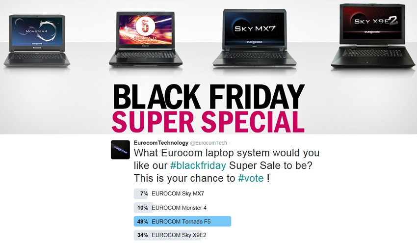 Nov 24, 2016 Eurocom launches Black Friday Super Sales on high performance, upgradeable Tornado F5, Sky X9E2, Monster 2, Sky MX7 laptops Contact: Braden Taylor 613-656-7961 btaylor@eurocom.com After Eurocom Twitter fans have had their chance to vote, Eurocom is launching Black Friday Super Sales on all systems that were voted on – the 15.6” Tornado F5, 17.3” Sky X9E2, 17.3” Sky MX7 and the 14” Monster 4. “Eurocom received such a great response we decided to discount all of the four system available for voting. We didn’t want to disappoint any of our fans that voted so the Tornado F5, Monster 4, Sky X9E2, Sky Mx7 are all on sale November 24th and 25th!” Mark Bialic, Eurocom President. Find Super Sales here: Tornado F5 10% off Tornado F5 Special Black Friday configuration? (20% discount included) Monster 4 10% off Sky X9E2 $300 off Sky MX7 10% off Over the past week, Eurocom has taken a fresh approach to Black Friday sales. Instead of announcing sales for products that they assumed would be in high demand, they took to Twitter to discover what products the customers wanted to see go on sale. Eurocom offered a choice of four in demand Eurocom systems, and people could vote on Twitter for which ones they wanted for a Black Friday Super Sale. Two candidates shot well above the competition: The Eurocom Tornado F5 (the newest addition to the Eurocom Super Gaming product line) and the SKY X9E2 – the most powerful laptop in the entire world. The two others were the Eurocom Monster 4, a super compact 14” little beast, and the SKY MX7, a thin and light 17.3” system with great performance and beautifully large display. A preconfigured EUROCOM Tornado F5 is also available for a 20% discount for those ready to push the limits or what is possible in a small and portable form factor. EUROCOM Tornado F5 Fully upgradeable, fully customizable, users can turn the EUROCOM Tornado F5 into the laptop of their dreams by selecting the components they want to fit inside this highly capable, yet very mobile chassis. EUROCOM Tornado F5 is designed to get the job done – take it to your worksite or office, the Tornado F5 is along for the ride of your life. The EUROCOM Tornado F5 couples NVIDIA GeForce GTX 1070 graphics, Intel Core i7 6700K processor, 64 GB memory all in a 15.6” chassis for mind blowing performance in a highly mobile chassis. Being fully upgradeable the EUROCOM Tornado F5 can support a variety of MXM 3.0b graphics cards including next generation NVIDIA GeForce GTX 1070, 1060 graphics, NVIDIA GeForce GTX 980M, 970M, 965M as well as professional grade NVIDIA Quadro M5000M, M3000M and M1100M graphics. Utilizing an Intel Z170 Chipset and LGA1151 socket gives the EUROCOM Tornado F5 the ability to support up to the Intel Core i7 6700k processor managing up to 64 GB DDR4 memory. Four drives are supported for up to 6 TB of storage support with two M.2 SSDs and two HDD/SSD. EUROCOM Sky X9E2 The Sky X9E2 is a VR Ready super high performance supercomputer laptop. Packing a desktop CPU and dual desktop GPU, and supported by an unlocked system BIOS, overclocking a laptop has never been so easy. The Sky X9E2 is so powerful it can utilize two 330 watt AC adapters. The EUROCOM Sky X9E2 is perfect for Virtual Reality developers covering vertical markets from education, training, medical, engineering, entertainment, military and content creators providing them with fully portable VR solution for on-the-go development and testing. The EUROCOM Sky X9E2 can support up to 16 GB of video memory via two NVIDIA GeForce GTX 1080 graphics cards giving users unmatched video performance. Utilizing an Intel Z170 Chipset and LGA1151 socket gives the EUROCOM Sky X9E2 the ability to support up to the Intel Core i7 6700k processor managing up to 64 GB DDR4 memory. Four drives are supported for up to 6 TB of storage support with two M.2 SSDs and two HDD/SSD. A 17.3” 120 hz panel tries to keep up with the mind blowing frame rates coming out of the dual NVIDIA GeForce GTX 1080 graphics cards. EUROCOM Monster 4 The EUROCOM Monster 4 offers shocking performance, buttery smooth frame rates, long battery life and ultra-portability. A perfect fit for those who want to conquer today’s mobile world. Performance comes by way of NVIDIA GeForce GTX 970M graphics and optional Intel Core i7 processors up to i7-6700HQ, up to 32 GB DDR4 memory and up to 3 TB storage with one M.2 SSD and one 7 mm storage drive bay. Up to 32 GB DDR3-1866 SODIMM memory is supported via two slots with 16 GB modules that are easy to access to upgrade or replace. The NVIDIA GeForce GTX 970M GPU provides a potent combination of immersive features and performance that you deserve for all your games, applications, and entertainment; while also providing intelligent power features to extend battery life. EUROCOM Sky MX7 The 17.3” Sky MX7 laptop is a potent combination of power in a thin and light system. The on-board, surface-mount design of the Intel Core i7 6700HQ CPU and NVIDIA GeForce GTX 980M GPU keeps this laptops’ weight down, and allows us to pack more performance and features into a slim form factor. The onboard components also minimize power consumption, which means less heat when you’re gaming on the go for a slim form factor, and a light weight! A whopping 64 GB DDR4 memory is supported via four SODIMM and is easily accessible and upgradeable. Four storage drives are supported for a maximum of 6 terabytes of solid state, RAIDable storage. A high performance, high quality copper thermal solution combined with high speed fans has been designed to keep the internal components within operating temperatures in such a thin chassis. About Eurocom: Eurocom is the leading developer of long lifespan, fully upgradable notebooks, as well as, high-performance mobile workstations and servers since 1989. Eurocom prides itself as an Industry leader in providing ground-breaking technology and continues to engineer innovative solutions that inspire